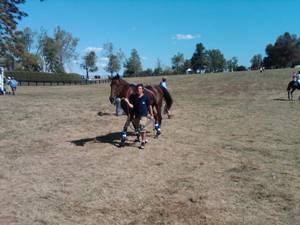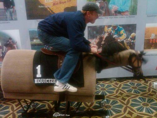 Travis Stanfield practicing for his new career on Bob the Racehorse.